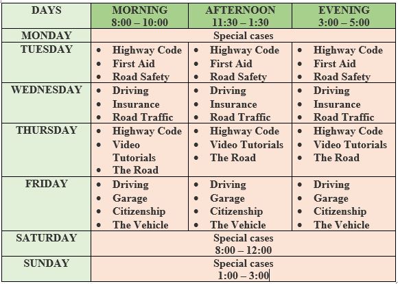 Before the driving test from the ministry of transport, we have a mock exams in the school for both the theory and practicals.The theory mock shall last for one(1) hour and is made up of forty(40) Multiple choice questions (MCQs ) set in the following proportions :